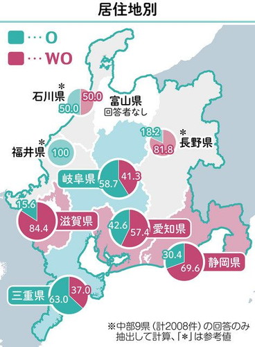 愛媛大学での調査結果は右の図のようになり、滋賀県は/wo/発音が多いようです。私の親、祖父祖母とも滋賀県の出身で、先祖伝来の教育であったことに納得し安心した次第です。